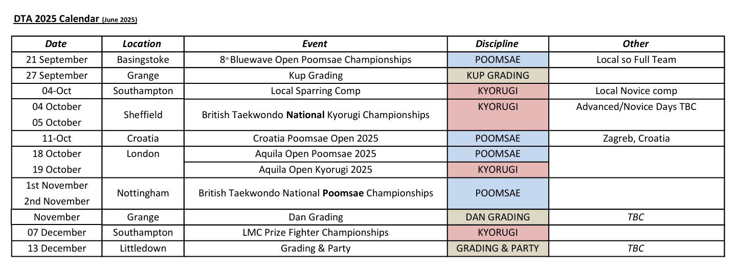 So we can all better plan we have tried to set dates for the competitions we will likely take teams to, and dates of Kup and Dan Gradings.